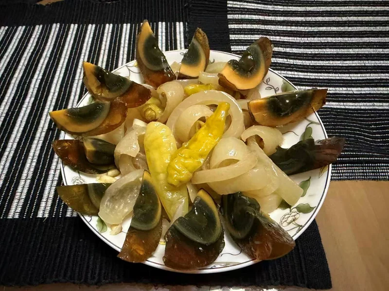皮蛋猪皮,猪皮用盐煮透与泡椒腌几天,加上买来的皮蛋算是自家预制