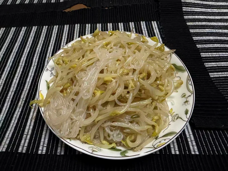 豆芽粉丝,简单煮一下豆芽和粉丝,葱姜丝带一小只干辣椒淋热花椒油,糖盐味精最后浇醋拌匀