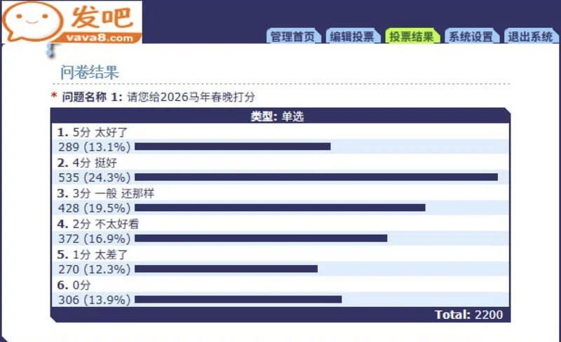 根据vava8发吧用户参与的“我给春晚打分”问卷调查显示,2026央视马年春晚的平均分53分(百分制)