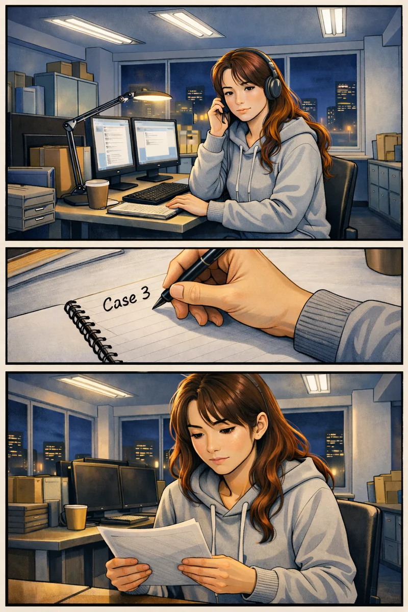 "您好,这里是东京咨询台的3号工作人员,请问有什么可以帮到您?"加奈子一边询问,一边习惯性地翻开眼前的笔记本,在上面写了一个Case 3。这是她今晚接到的第三通咨询电话,前两通电话的记录还墨迹未干。尽管她从中捕捉到了一点关键信息,但沟通最终都未能产生实质进展,于是在每条记录末尾,她都画上了一个小小的三角符号。这是她独有的标记系统:圆圈代表目的明确、沟通顺畅且已圆满解决的案例;三角则标记那些悬而未决、尚需探索的悬案;至于那个较少使用的叉号,则留给那些让她完全无从下手、不明就里的来电——那样的个案,通常会被移交早班同事持续跟进,或与来电者另行约定沟通时间。