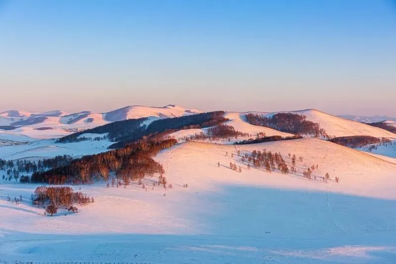 如果起得够早,可以赶去暖水河拍日出。在零下几十摄氏度的环境下,因地下温泉滋养,竟然有一条不冻河在此潺潺流淌。日出时分,水面蒸腾着雾气,宛如仙境,摄影爱好者们称呼此区域为“暖水魔界”,是出片必去之地。等到日落,天空又被染上一层粉色,美得让人屏息。